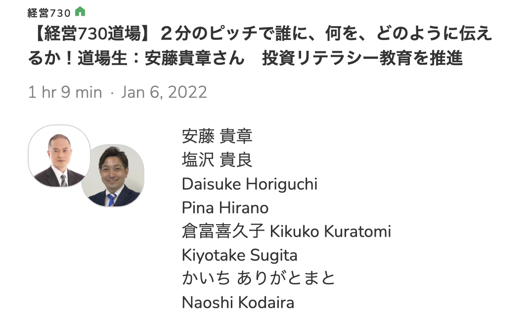2022.01.06 クラブハウスで経営730道場に出演 【経営730道場】2分のピッチで誰に、何を、どのように伝えるか! 道場生:安藤貴章さん 投資リテラシー教育を推進 https://www.clubhouse.com/room/PD0NO5wb Tweet Share +1 Hatena Pocket RSS feedly Pin it 【テレビ番組】杉村太蔵の情熱先生TVに出演します